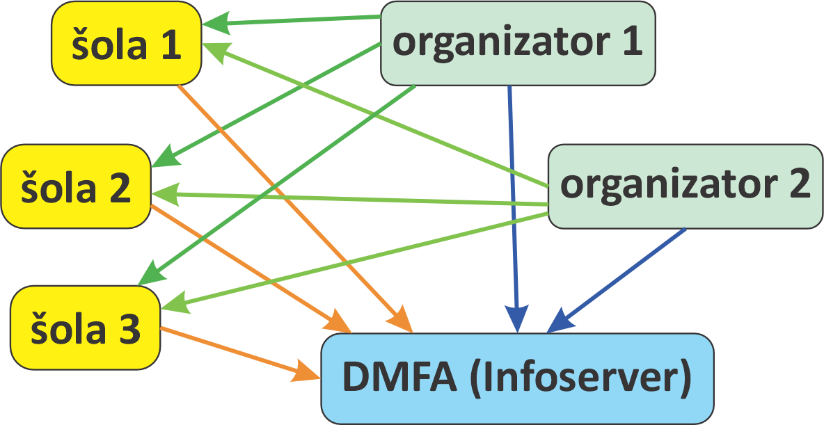 Iz navedenega torej sledi, da mora vsaka šola skleniti pogodbo z DMFA Slovenije (kot ponudnik platforme Infoserver), kjer šola nastopa kot upravljalec in z vsakim organizatorjem, kjer šola nastopa kot obdelovalec. DMFA Slovenije (kot ponudnik platforme) pa z vsakim organizatorjem sklene pogodbo, kjer je organizator upravljalec podatkov. (Na spodnji sliki so s puščicami prikazana pogodbena razmerja. Puščica vedno kaže v smeri od upravljalca do obdelovalca.)