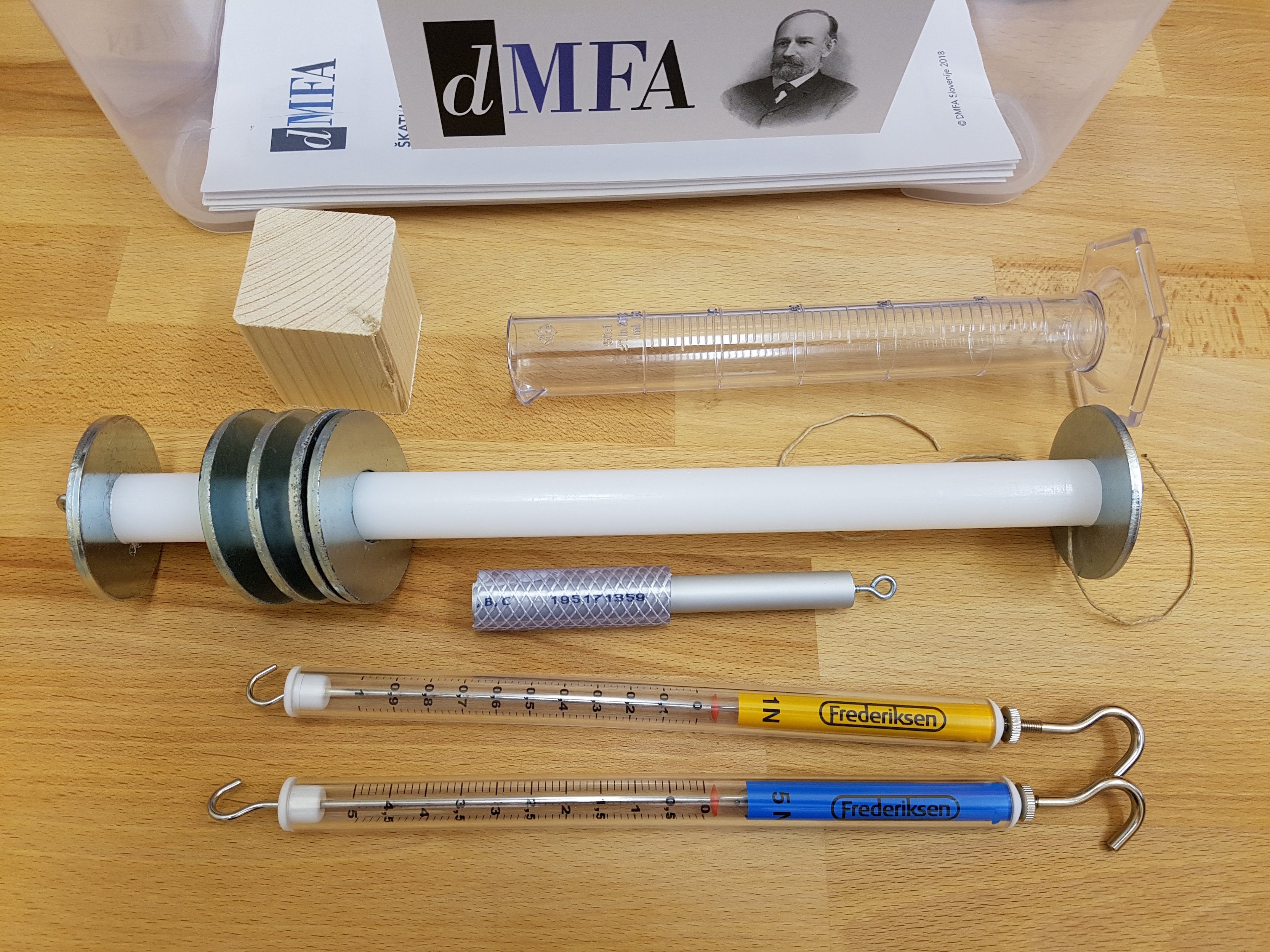 V škatli sta 2 silomera (za 1 N in za 5 N), merilni valj (50 ml), dve telesi (eno s premičnimi obročki, za merjenje sil - navorov, drugo sestavljeno iz aluminijaste cevi in PVC cevi za merjenje vzgona), merilo (50 cm, ni na fotografiji), podpora. Priložen je komplet nalog z državnega tekmovanja v znanju fizike za Stefanova priznanja 2018.