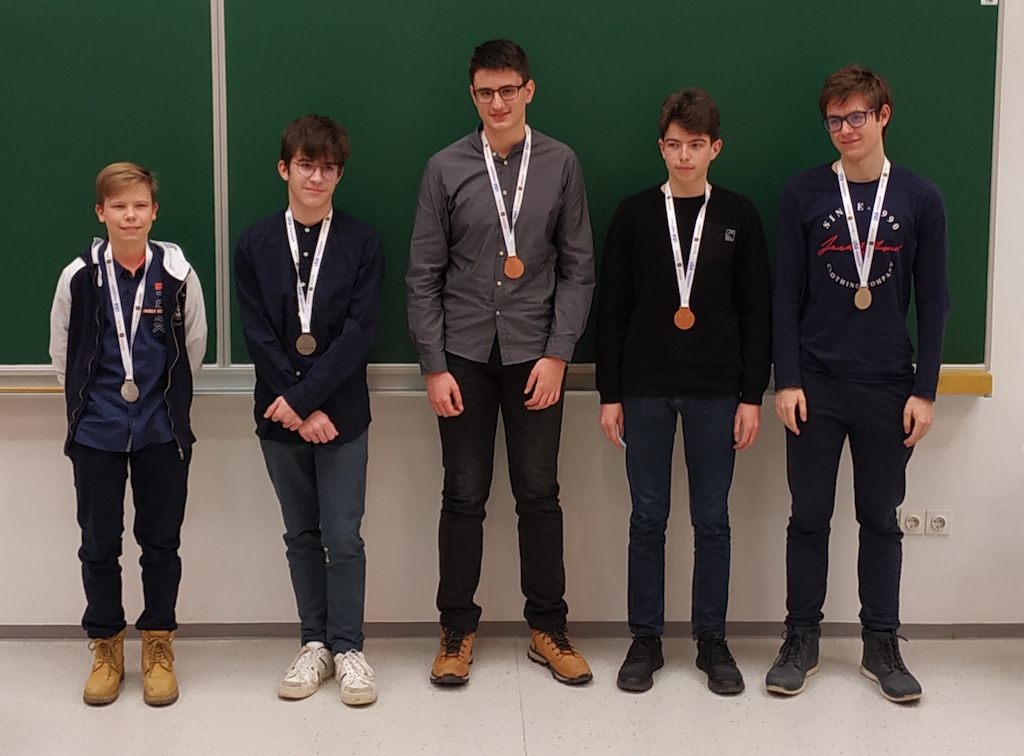 Na skupinski fotografiji medalistov manjka Žan Arsov; prisotni pa so, z leve, Aljaž Erman, Martin Alojz Flisar, Enej Jauk, Aleksander Kosanović in Tomaž Holc.