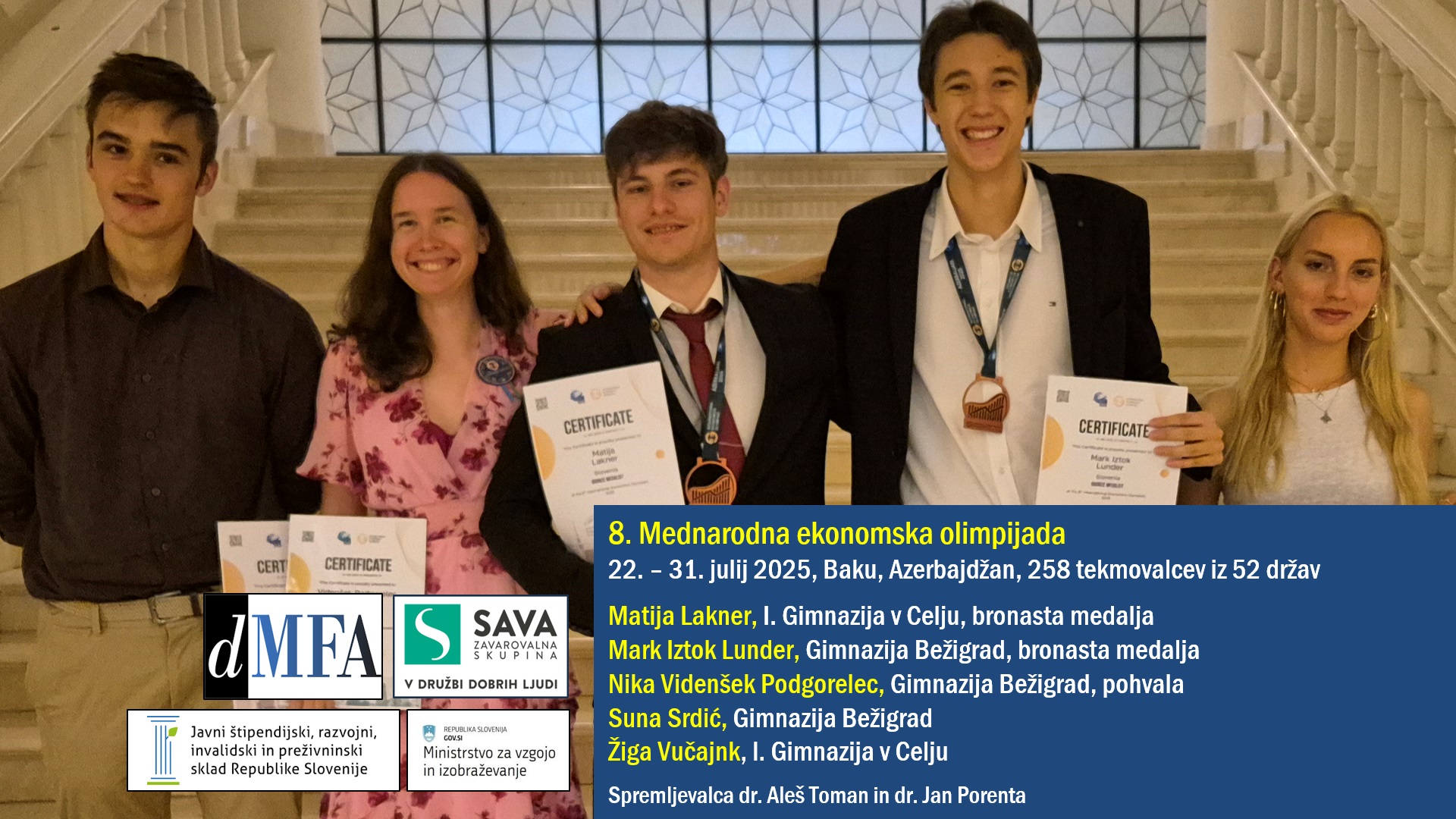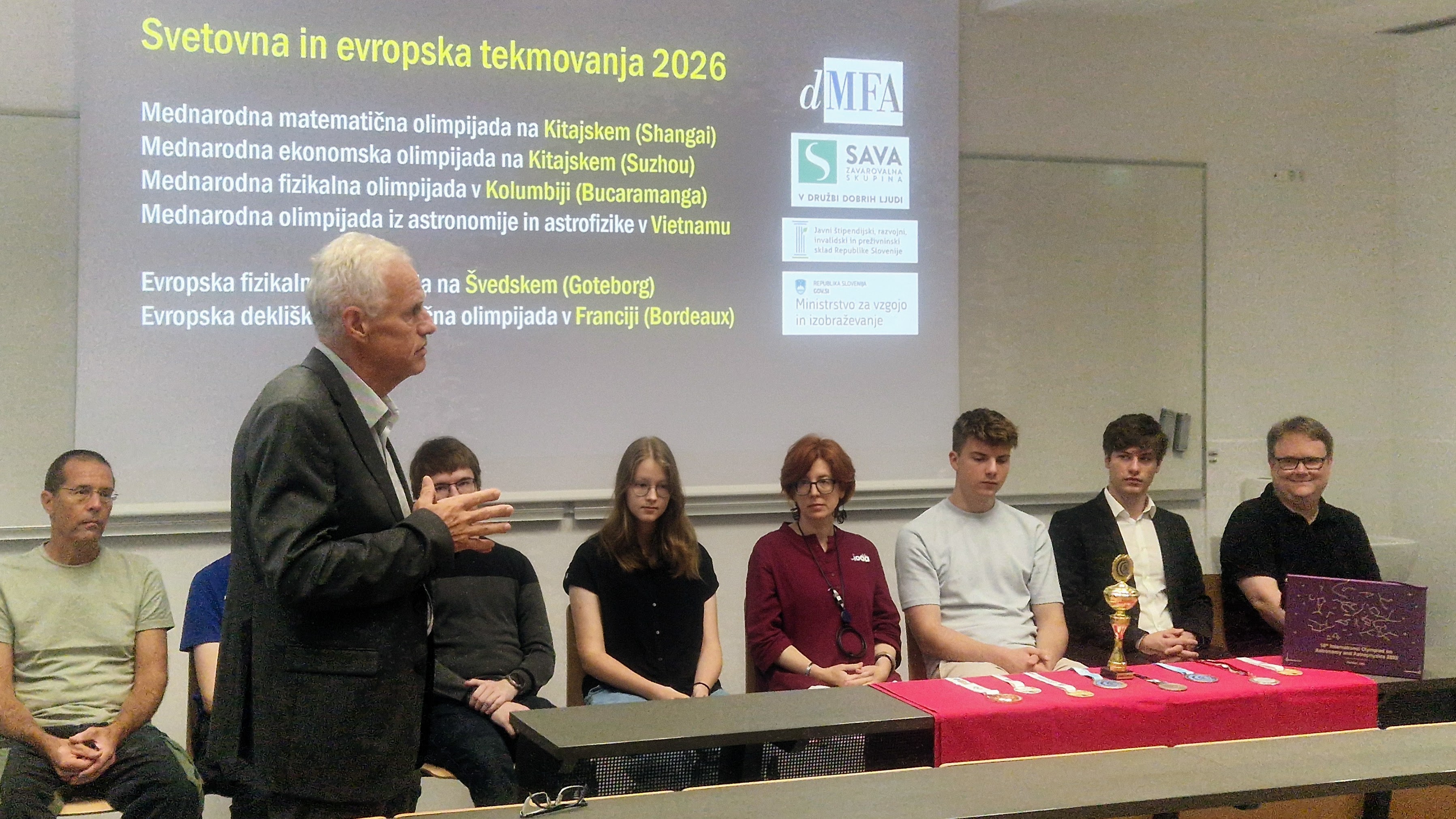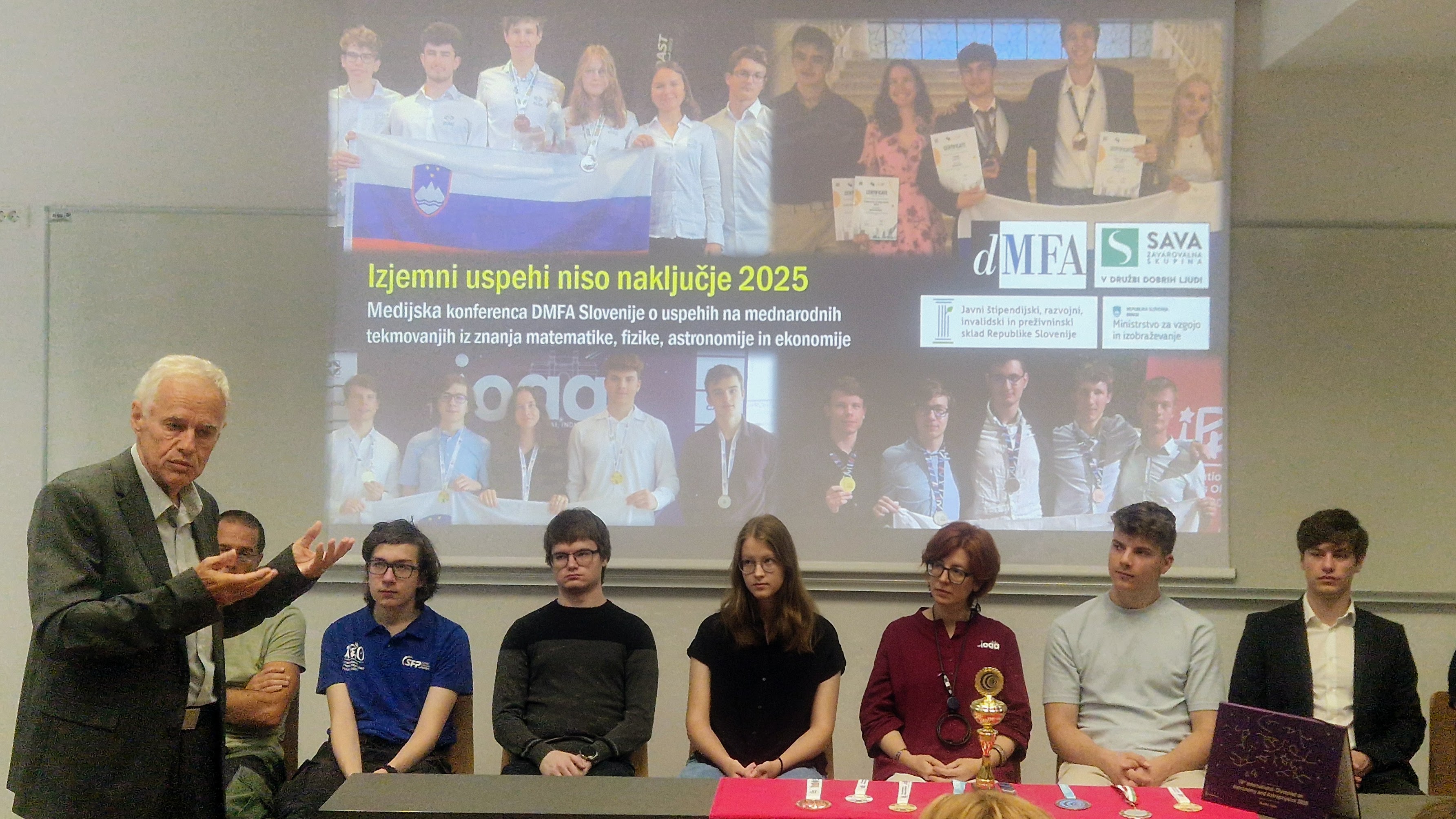 Slovenski tekmovalci so na letošnjih svetovnih in evropskih olimpijadah iz astronomije, fizike, matematike in ekonomije ponovno dosegli izjemne uspehe: 4 zlate, 8 srebrnih in 6 bronastih medalj. V torek, 9. 9. 2025 ob 11h smo v prostorih Fakultete za matematiko in fiziko v Ljubljani pripravili medijsko konferenco, na kateri smo skupaj s tekmovalci in spremljevalci predstavili letošnja tekmovanja in izjemne tekmovalne uspehe, sistemsko ozadje uspehov (vloga DMFA Slovenije, šol in šolskih mentorjev, fakultet, tekmovanj, državne in sponzorske podpore), ter program priprav in udeležbe na olimpijadah v letu 2026.