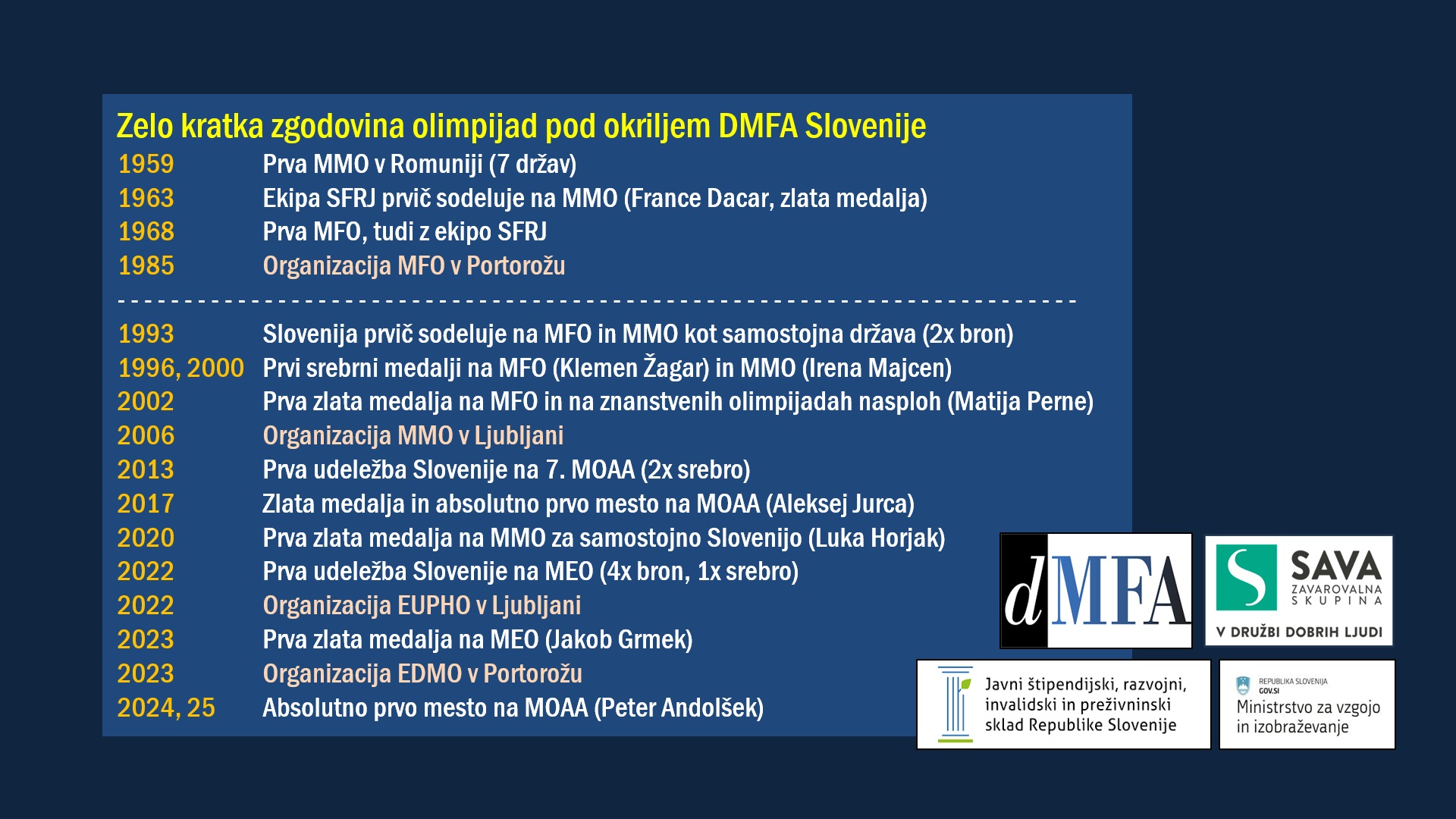 Po kratki predstavitvi zgodovine sodelovanja DMFA Slovenije na mednarodnih olimpijadah smo povzeli letošnje rezultate iz svetovnih in evropskih tekmovanj MMO, MFO, MEO, MOAA, EFO in EDMO.