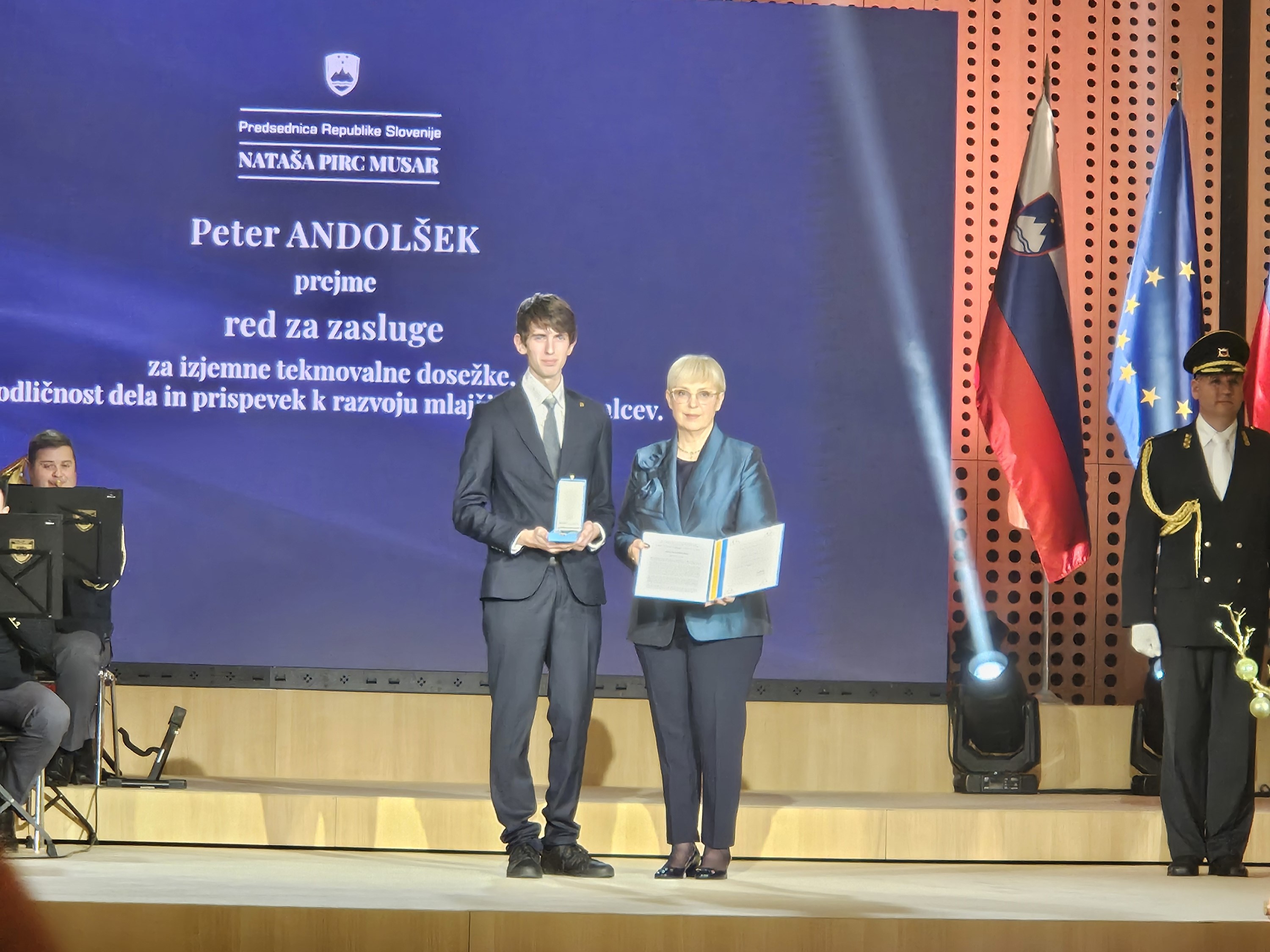 Predsednica Republike Slovenije Nataša Pirc Musar je pred Dnevom samostojnosti in enotnosti na Brdu pri Kranju podelila najvišja odlikovanja države za izjemne zasluge in dejanja posebnega pomena za blaginjo Slovenije. Prejelo jih je 25 prejemnic in prejemnikov, med njimi tudi študent fizike Peter Andolšek, ki ga je naše društvo ob podpori SAZU predlagalo na podlagi njegovih izjemnih uspehov na mednarodnih tekmovanjih, posebej na Mednarodni olimpijadi iz astronomije in astrofizike, na kateri je kar dve leti zapored osvojil absolutno prvo mesto.