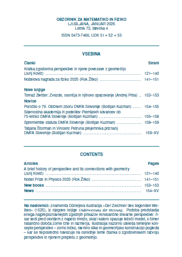 Izšla je nova številka revije OMF, ki prinaša zanimiva članka iz področij matematike in fizike in prispevek o novi knjigi in novice o občnem zboru, slavnostni akademiji, spremembi statuta in nagrajencih. Elektronska verzija (PDF) zadnje številke je dosegljiva tukaj, arhiv starih številk pa najdete v zavihku Založba/Obzornik za matematiko in fiziko. Vabljeni k branju!