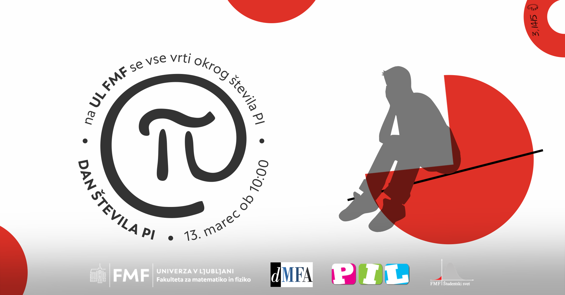 Pridružite se matematičnim navdušencem na Fakulteti za matematiko in fiziko UL, kjer bodo v petek, 13. marca 2026 ob 10:00 ponovno praznovali Dan števila PI, ko se vse vrti okoli števila PI, novega znanja in zabave! Podrobnosti programa bodo razkrite kmalu, zato si že zdaj rezervirajte datum in začnite s pripravami!