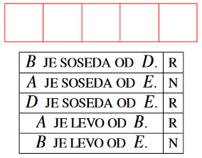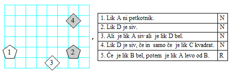 V 1 × n kvadratkov je potrebno vpisati začetne črke A, B, C, … tako, da bodo spodnje trditve resnične (R) oz. neresnične (N).