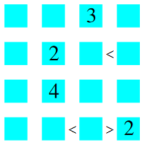 V n × n kvadratkov moraš vpisati začetna naravna števila od 1 do n tako, da bo v vsaki vrstici in v vsakem stolpcu nastopalo vseh n števil ter da bodo izpolnjene vse relacije.