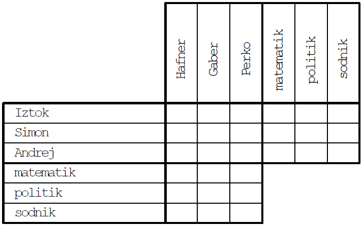 Za vsakega določi priimek in poklic, če velja: 1. Gaber ni ne matematik ne sodnik. 2. Hafner po poklicu ni sodnik. 3. Iztok se ne piše ne Hafner ne Gaber. 4. Simon se ne piše Gaber.